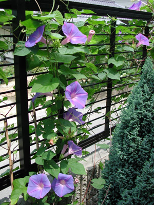 宿根朝顔のオーシャンブルーは、一日中咲いてくれますが、さすがにこのところの35℃続きにはちょっと参っているようです。午後にはやや元気がなくなります。