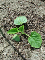ゴーヤこと苦うり 去年はたくさん収穫できて、あのほろ苦さ を楽しみました。葉っぱが虫に食べられて います・・・。 |